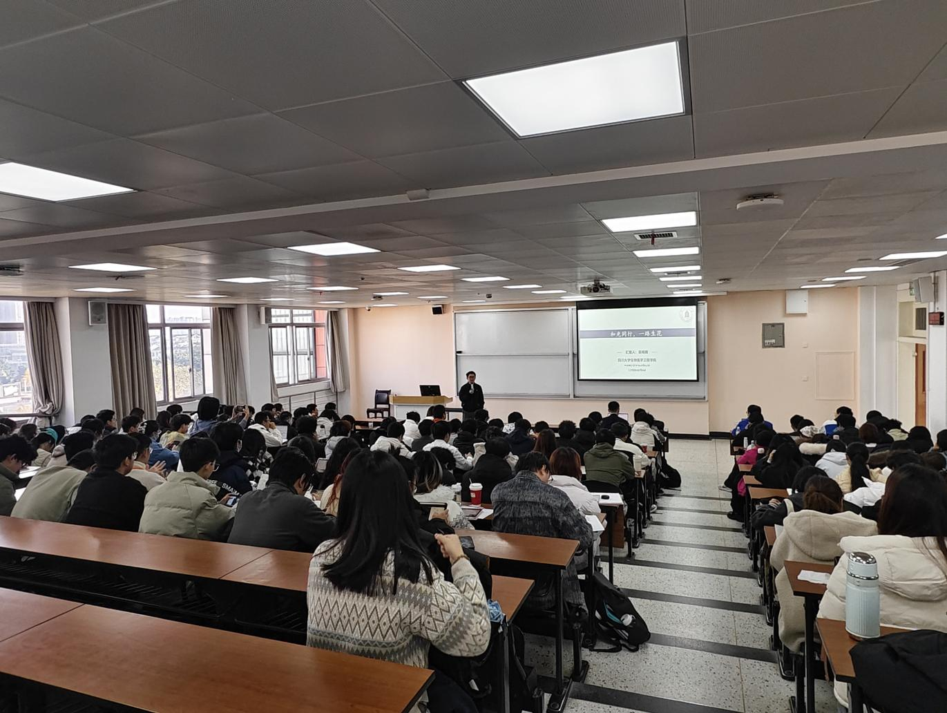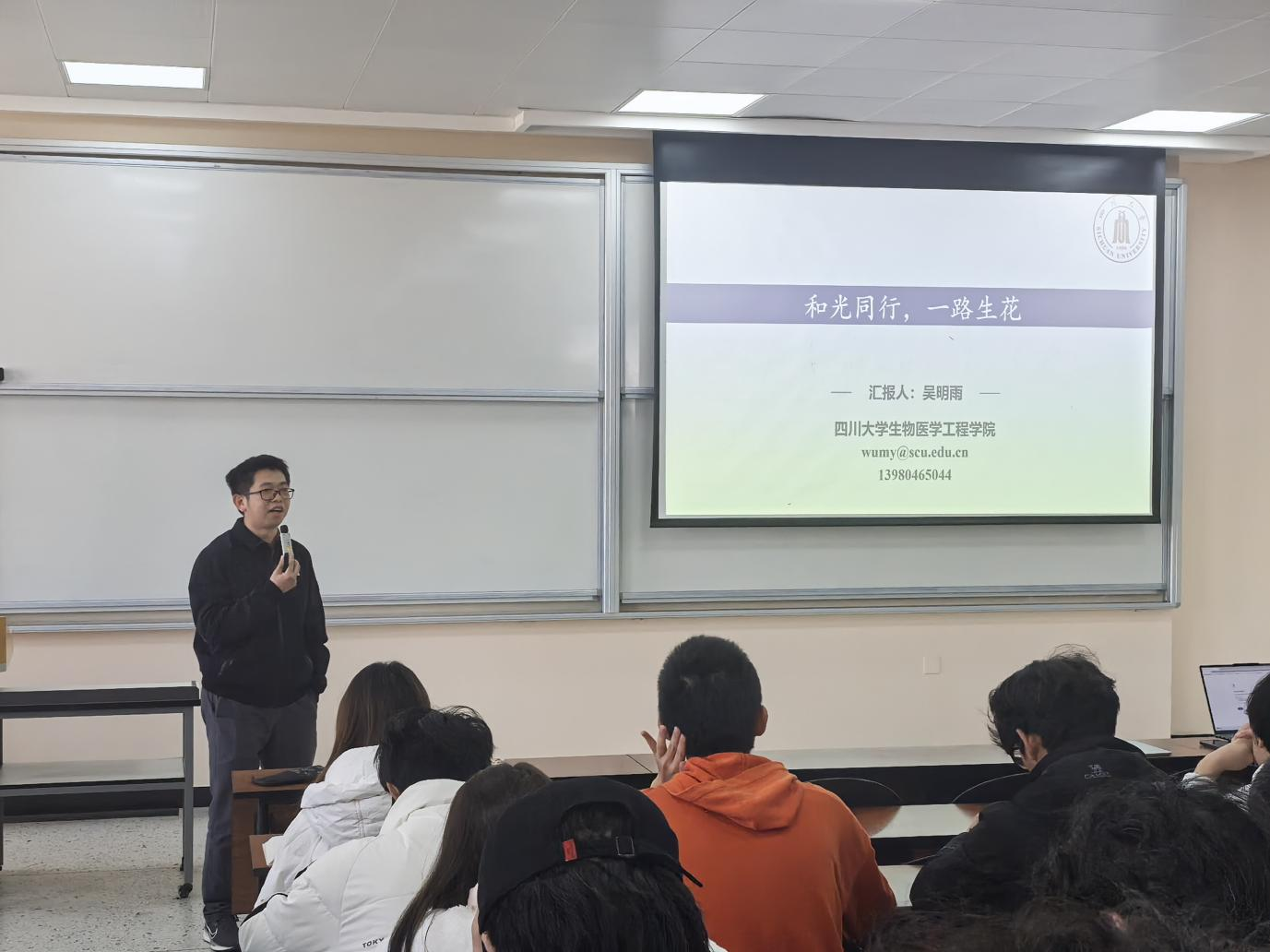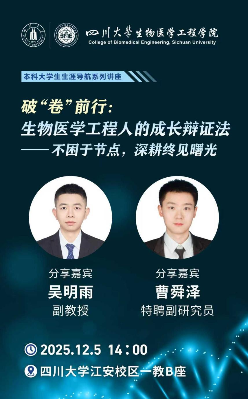 12月5日,首场讲座面向大二年级学生举行,主题为“破‘卷’前行:生物医学工程人的成长辩证法——不困于节点,深耕终见曙光”。色情直播 副教授吴明雨与特聘副研究员曹舜泽以“过来人”身份,结合自身求学、科研与生活经历,与同学们展开深度交流。