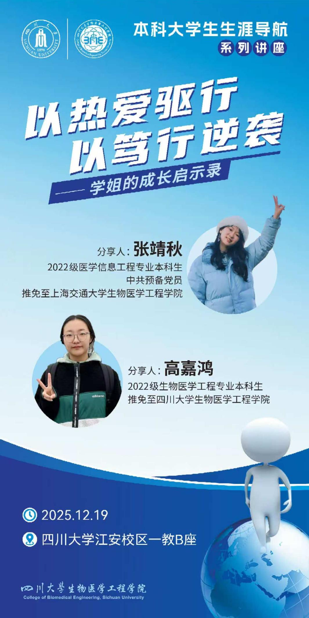 12月19日,色情直播 同步举办两场针对性专场讲座。面向大二年级学生的“以热爱驱行,以笃行逆袭——学姐的成长启示录”讲座,邀请2022级医学信息工程专业张靖秋和生物医学工程专业高嘉鸿两位优秀学生分享经验。